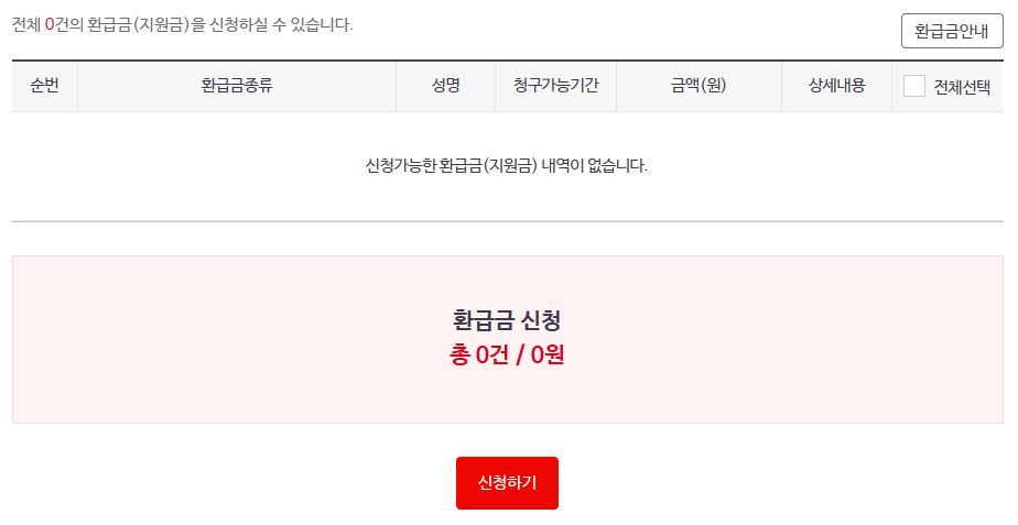 그럼 다음과 같이 조회 및 신청 내용이 나타나는 창이 뜨게 되는데 환급할 내용이 있으신 분들은 환급금 내용이 나타나게 됩니다. 신청하기 버튼을 눌러 지급계좌를 입력 후 신청하시면 됩니다.